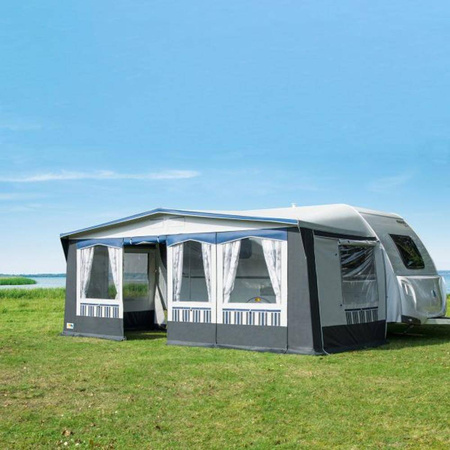 The ideal PVC awning for both permanent and seasonal campers as well as for those conscious of quality and comfort. Window flaps made of canvas. Heavy and covered zips. Double curtain rail and curtains with roll suspension. Hemstitch pockets in the canopy. Velcro strip channels for increased storm resistance. Suitable for vehicles with aerodynamic bow design (KNAUS, Bürstner, Eifelland, etc.).