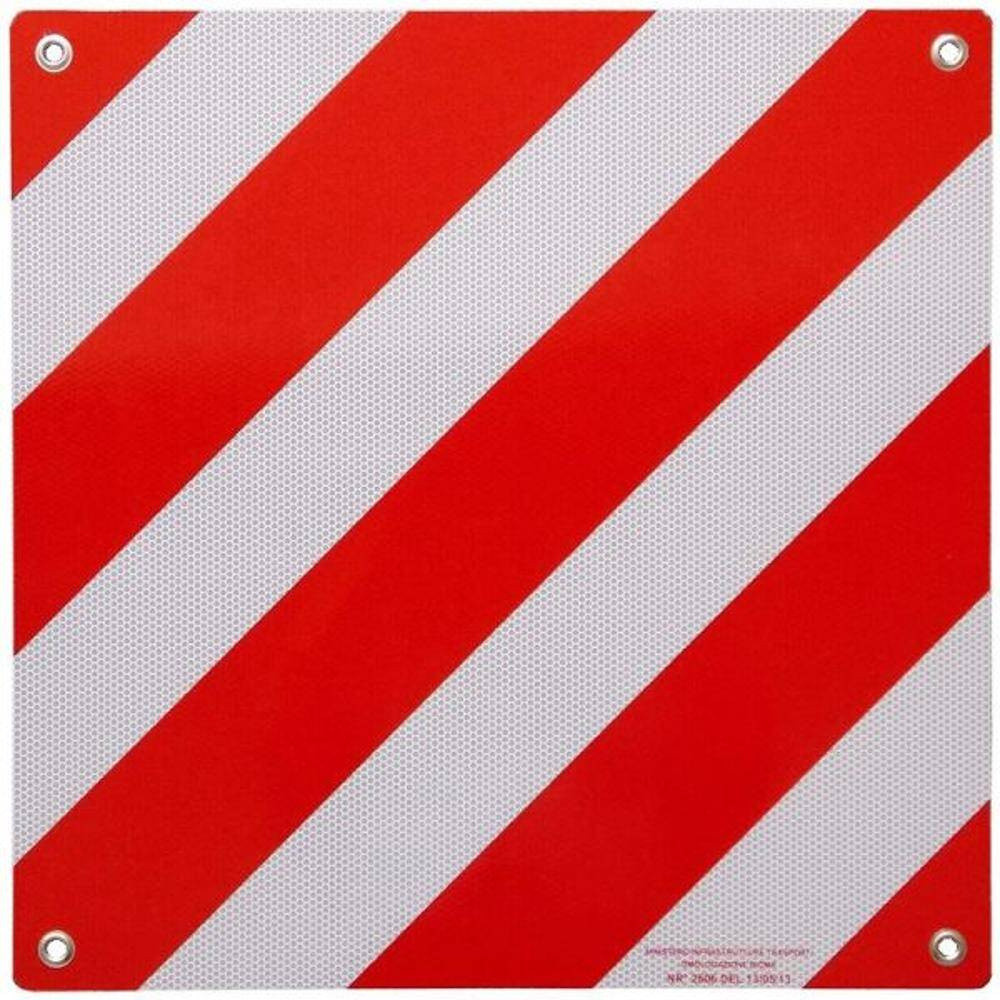 For overhanging loads. According to the Italian Highway Law, aluminium warning signs are required since 1/1/1995. They are covered with a special reflective foil and must have four holes with eyelets.