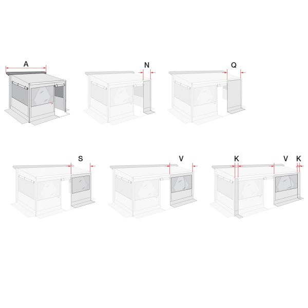 Front wall: If your awning is 360 cm long or longer, you need the Privacy Room CS Light XL 310. You then also need a front wall extension, the size of which depends on the length of your awning.