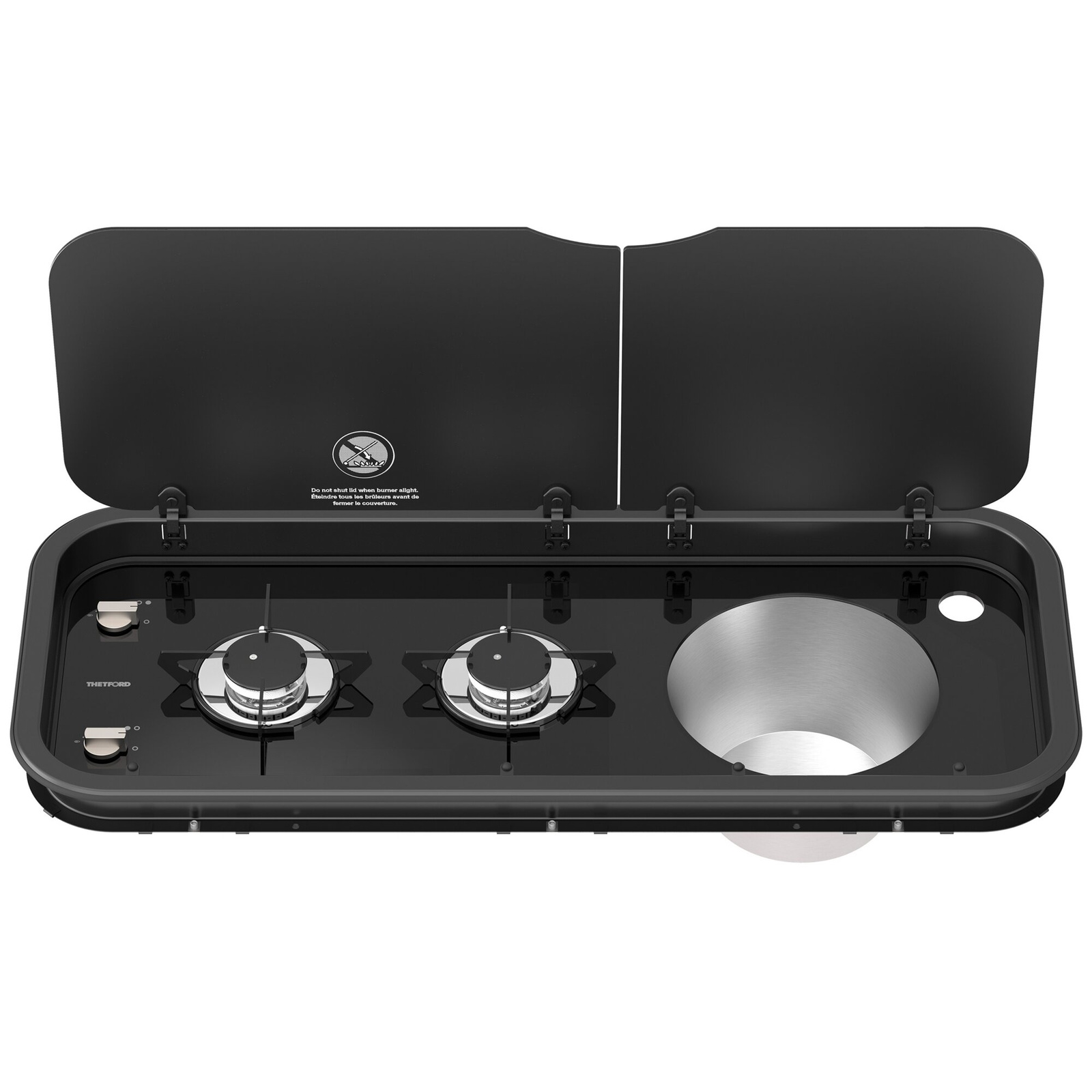 Topline 111 is a combination appliance made of high-quality materials that was specially developed for campervans. The dimensions are optimized for the narrow kitchen layout of campervans and offer the basic functions of 2 gas burners and a sink; with electric ignition; gas shut-off function when the cover is closed; output 2 x 1.5 kW, cut-out dimensions W 88.8 x D 35.8 cm, external dimensions W 90 x 19.5 x 37 cm, weight 11 kg.