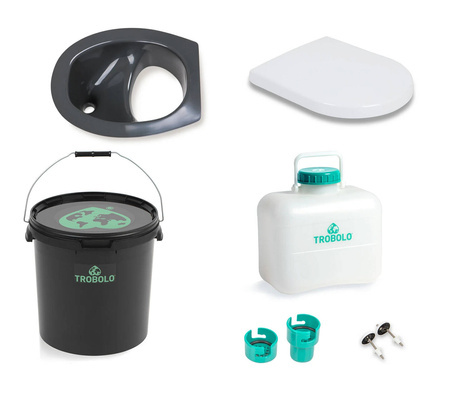 TROBOLO DIY set for the self-construction of your composting toilet. The set consists of our composting toilet insert in grey or white as well as a solids container (22l) and liquids container (10l).