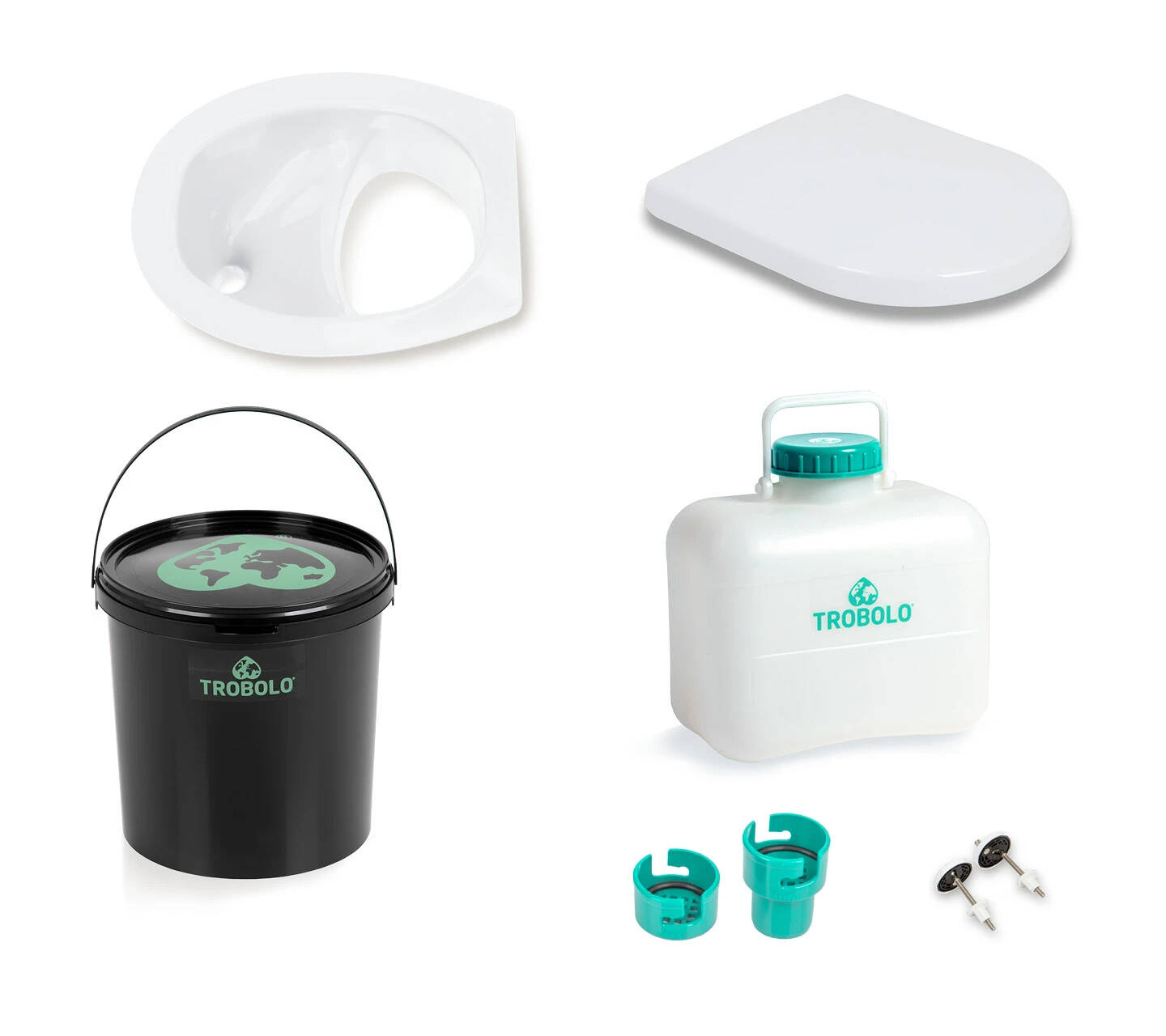 TROBOLO DIY set for the self-construction of your composting toilet. The set consists of our composting toilet insert in grey or white as well as a solids container (22l) and liquids container (10l).