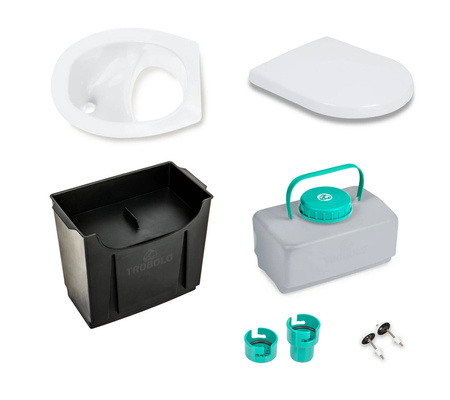 TROBOLO DIY set for the self-construction of your composting toilet. The set consists of our composting toilet insert in grey or white as well as a solids container (6.5l) and liquids container (4.6l).