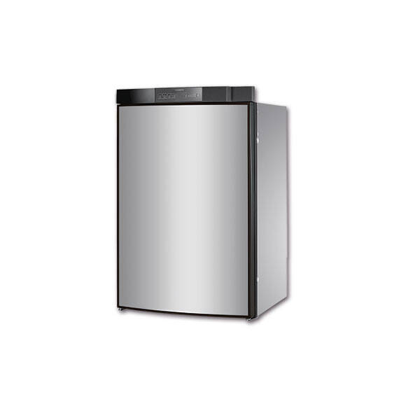 Dometic Series 8 three-door refrigerator, model RM8401, 95L. Dimensions (WxDxH) 486 x 569 x 821 mm. RM8401 with manual MES energy selection. Hinge on left side.