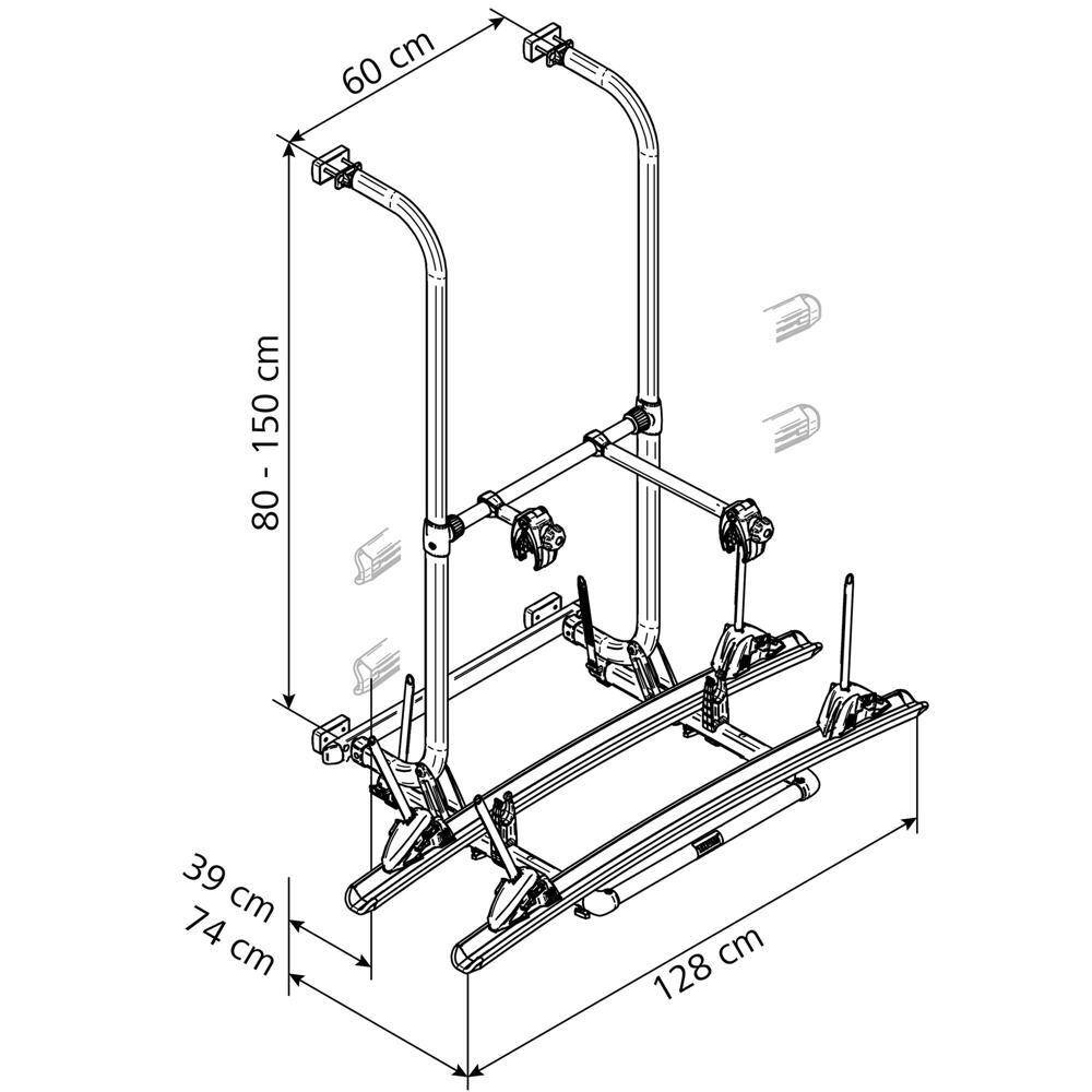 Bike rack equipped with massive oval tubes made of anodised aluminium for extra safety and stability while transporting bikes, injection moulding parts made of plastic and aluminium ensure excellent craftsmanship. An innovative platform locking device ensures that the carrier makes no sudden movements on rough roads. The carrier is equipped with 2 flexible bike rails, which can be moved sideways, including the bike. Installation is done with a sturdy fastening rail, installed underneath by invisible fastening points. Thanks to this rail and an optional mounting rail (item no. 89 450) for the upper fixation, the load is evenly distributed on the vehicle wall. The carrier can be extended by a 3rd variable and a 4th fixated rail. The sturdy carrying frame for bikes is pre-assembled and has a load capacity of 60 kg (max. 30 kg per rail); per rail, one spacer with a soft surface is included, suitable for bike cross bars up to ø 70 mm. The installation height depends on the version and varies from 50 to 150 cm.