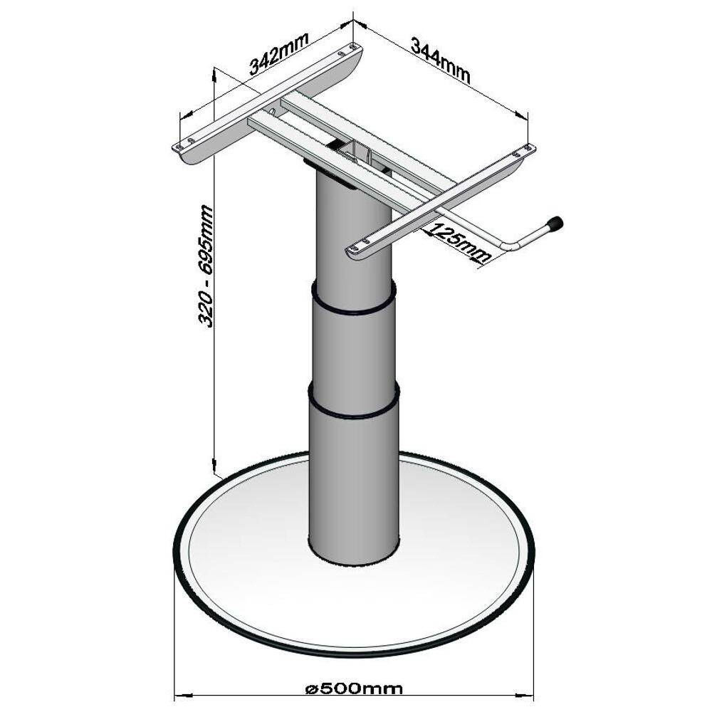 Ideal for caravans. Height-adjustable by 37.5 cm. Bottom height to bottom edge tabletop 32 cm. Upper height to bottom edge tabletop 69.5 cm. Tabletop is not included in delivery.