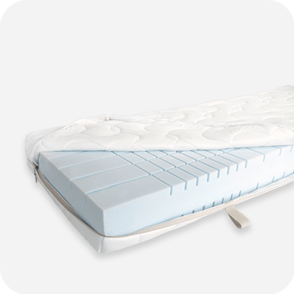 High-quality cold foam mattress with soya content. Dimensions: Customised dimensions, slopes and curves possible. Firmness: H2 (medium), H3 (firm) Cover: quilted double fabric, breathable, anti-allergenic, washable up to 60°, 100% polyester 3-sided zip, 4 turning loops