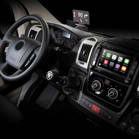 Retrofit-set for Fiat Ducato 7 or 8, also specifically suitable for connecting it to the navigation system AVIC-Z1000DU. On the display, if installed by the manufacturer, the driving-assistant systems traffic sign recognition and lane-keeping assistant as well as the speed (also without AVIC) can be displayed. If connected to the navigation system Pioneer AVIC-Z1000DU, also the display of navigation directions is possible. Brightness and viewing angle of the retractable display are adjustable.