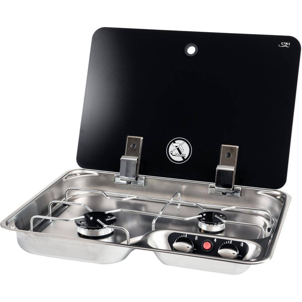 Built-in hob with lid made of tempered safety glass. With electric ignition (a supply voltage of 12 V is required) and safety ignition system; including seal, connection pressure 30 mbar, output 1 x 1 kW, consumption 1 x 73 g/ h, 1 x 124 g/ h. Installation depth 8 cm, cut-out dimensions 44 x 32 cm, exterior dimensions 46 x 33.5 cm, weight 4.6 kg.