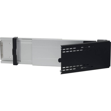 Extension suitable for side mounting in and on cabinets, which can be easily locked and unlocked by means of Push Lock and a spring steel bracket. Its retaining plate can be rotated 190°, easily adjusting it to the desired position. The extension can be pulled out by max. 47 cm, rail length extended approx. 83.5 cm. Made of aluminium, load capacity 6.5 kg. Dimensions approx. W 41 x D 4.4 x H 15.5 cm, weight 2.2 kg.