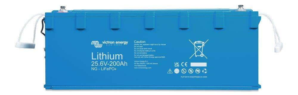 Victron Energy Lithium NG batteries are Lithium Iron Phosphate (LiFePO4 or LFP) batteries available with a nominal voltage of 12.8 V, 25.6 V and 51.2 V in various capacities. They can be connected in series, parallel and series/parallel so that a battery bank can be built for system voltages of 12 V, 24 V or 48 V. The maximum number of batteries in one system is 50, which results in a maximum energy storage of 192 kWh in a 12 V system and up to 384 kWh in a 24 V and 48 V system.
