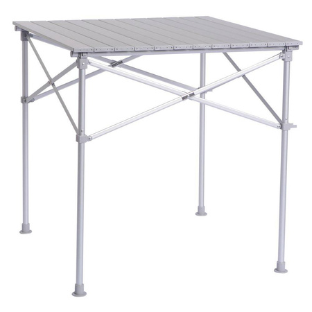 Extremely light and compact. Folding frame made of coated aluminium tube. Can be folded like scissors. Rollable tabletop made of elegant aluminium lamellas. Perfect for mobile campers. Packed in a handy bag.