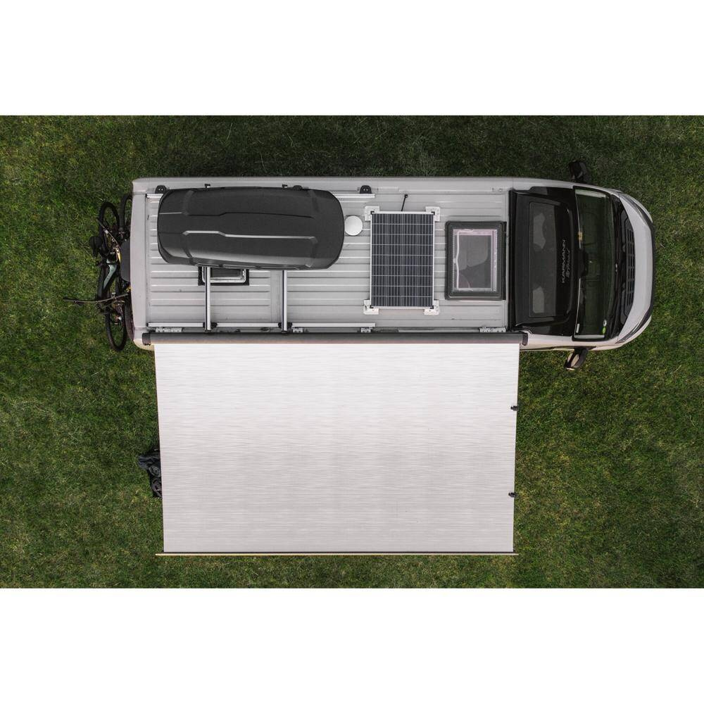 Flexible roof carrier solution for the Fiat Ducato built since 2006/07 with H2 roof, rail length 1.64 m, load capacity 100 kg. It has been designed for campervans where roof superstructures, such as skylights or refrigerator ventilation prevent the installation of continuous longitudinal rails. The installation is done without drilling onto 4 fixating points of the vehicle and a full-surface adhesion, whereas the roof in the area of the longitudinal rails has to be free of obstacles 10 cm to the inside. The system is compatible to an awning Thule Omnistor 6300 in the length 3.25, 3.75 or 4 m. The awning has to be installed to the adapter 90 628 (3.25 m) or 90 629 (3.75/4 m). It can also be used without awning, e.g. to install crossbars or brackets for sports equipment.