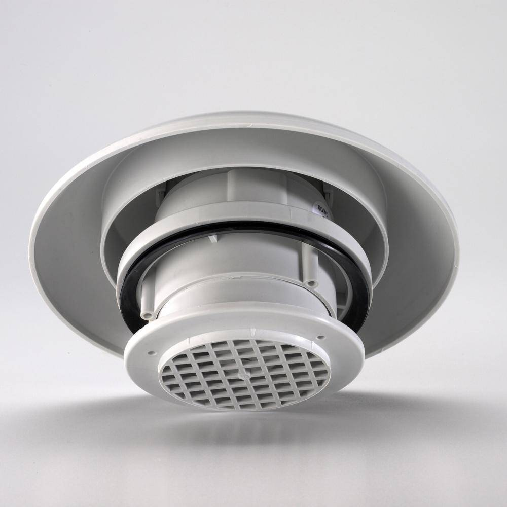 Light grey roof vent with motor. Air volume: max. 60 m³/h. Fully suppressed. Height above roof: 75 mm.