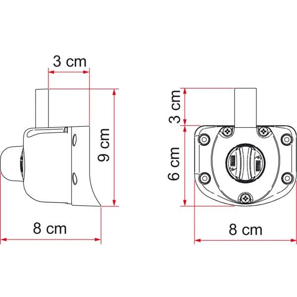 Safety block for installation inside the door or garage of motorhomes and caravans, for blocking the front door of the motorhome. Made of robust die-cast aluminium. Without plastic parts. To be fitted in place of the standard weak plastic locks. The existing holes can be used. Scope of delivery: 2 pieces.