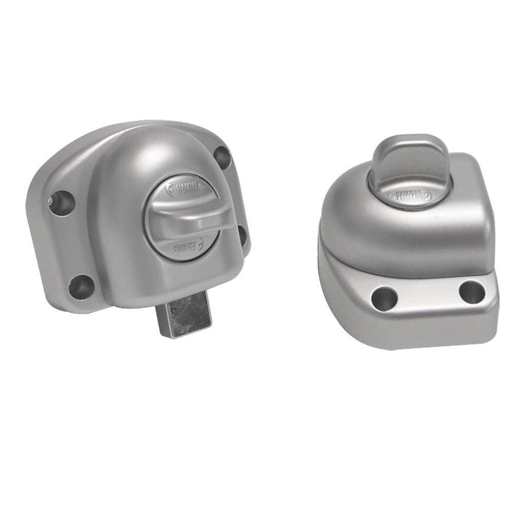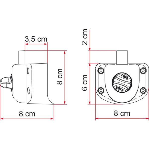 Safety block for installation inside the door or garage of motorhomes and caravans, for blocking the front door of the motorhome. Made of robust die-cast aluminium. Without plastic parts. To be fitted in place of the standard weak plastic locks. The existing holes can be used. Scope of delivery: 2 pieces.