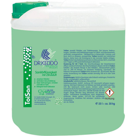 ToiSan liquefies faeces, dissolves limescale deposits and urine scale on toilet tank walls and prevents the formation of unpleasant odours in the waste tank. The sanitary liquid spreads a fresh scent. Biodegradable.