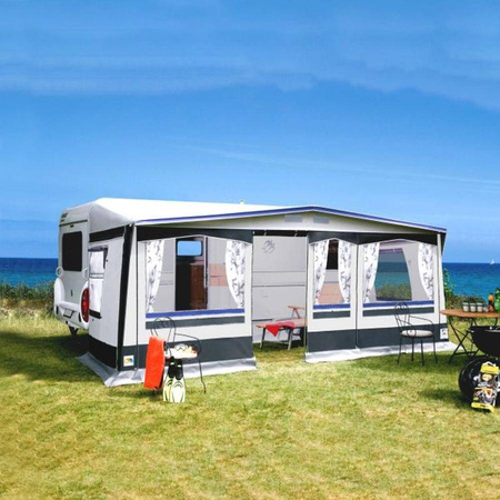 Seven-part awning completely made of washable, weatherproof PVC. Exterior mud flap, tensioning on the inside, storm straps at the front wall. Can also be used as a sun canopy if you remove the front and side walls. Covered zips. Window segments with PVC window covers. With over-welded roof seam as standard.
