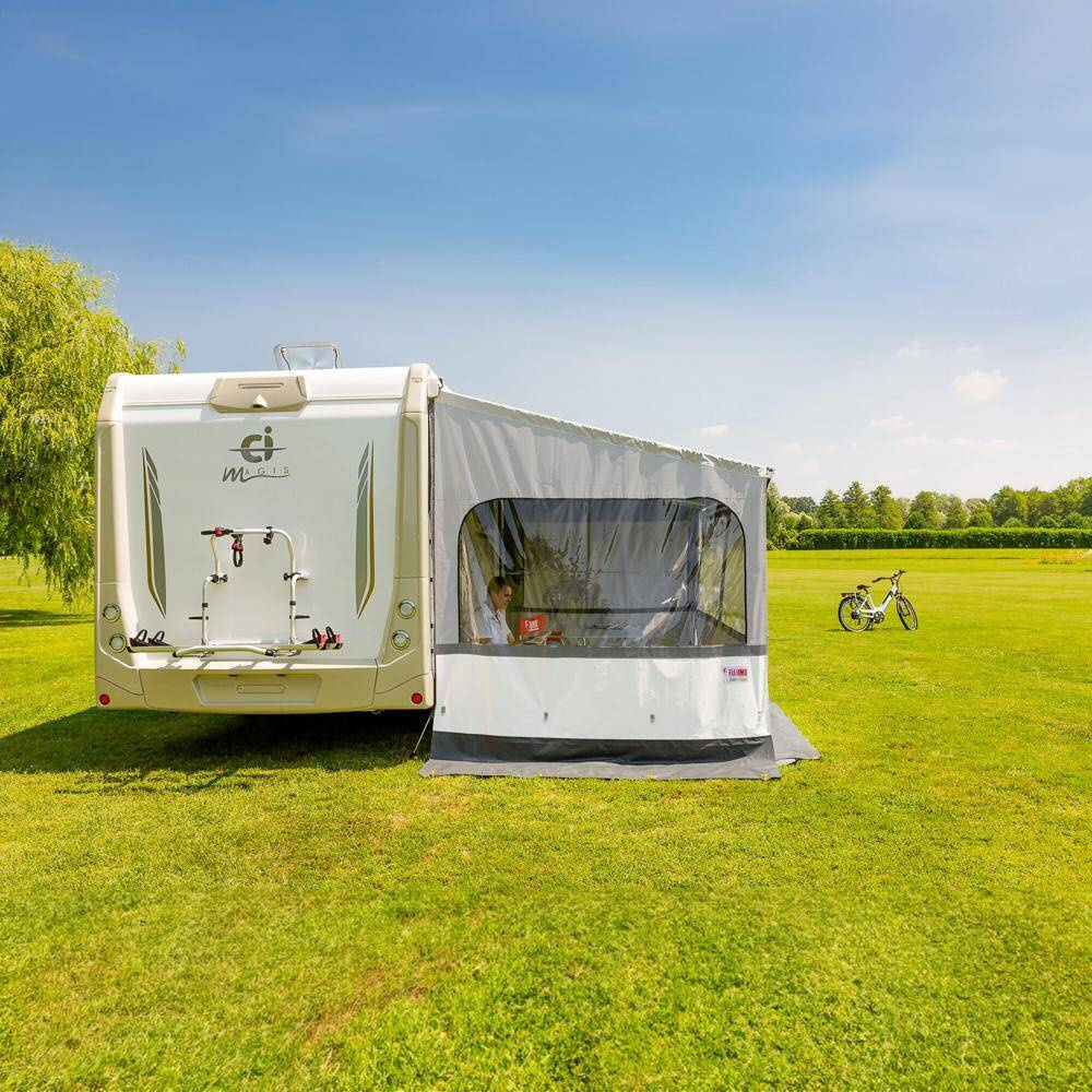 Convenient side wall with large window and groundsheet extension. Made of water-repellent, UV-resistant and washable vinyl. Simple assembly thanks to the included telescopic aluminium poles and ground spikes. Can be used on the left- and right-hand side. Incl. adapter.