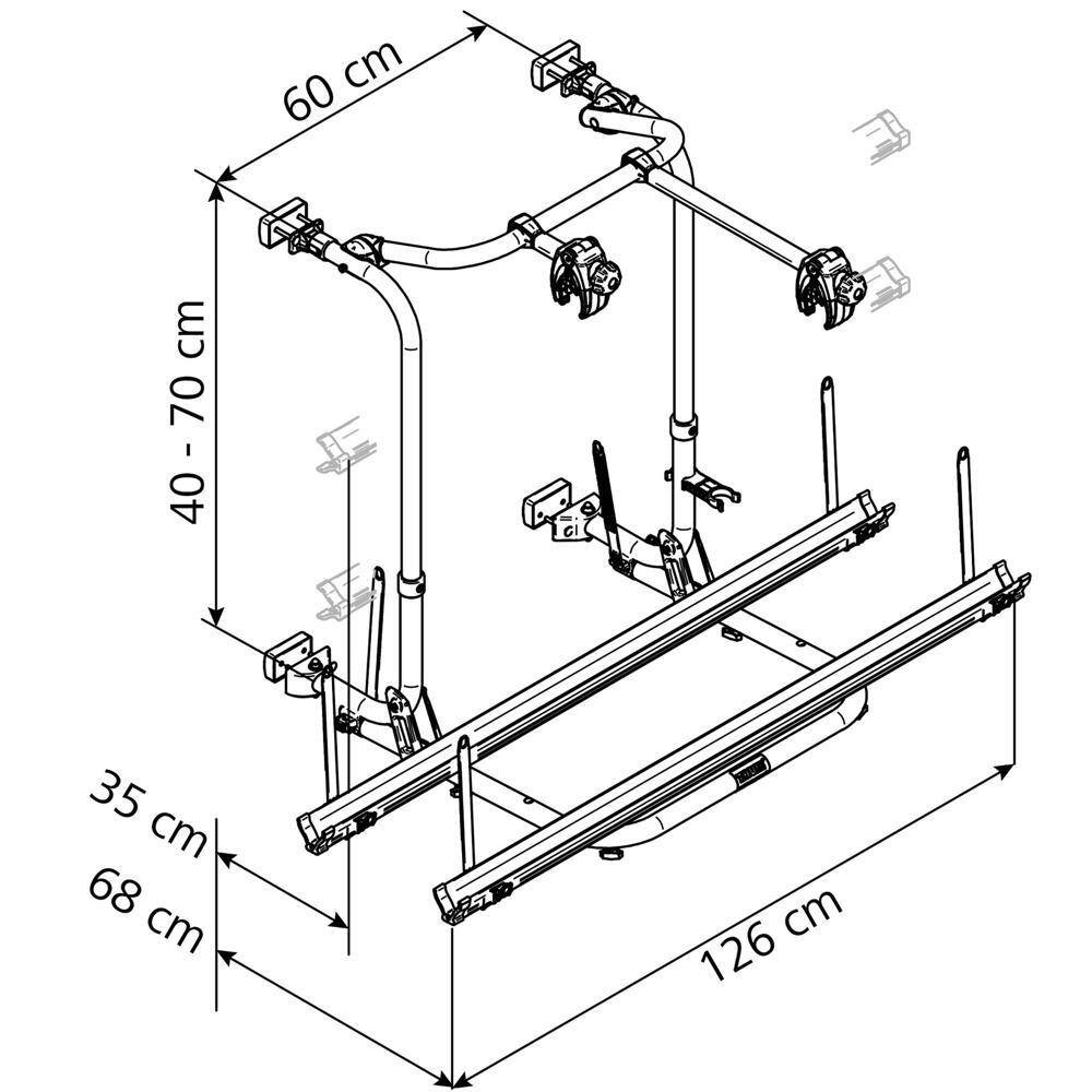 Bike carrier made of round, anodized aluminium tube, based on the established Thule range. The Thule Sport G2 is equipped with bike rails, in which even wide bicycle tires find enough space and good grip. One bike holder is included per bike rail, protecting the bikes’ varnishing with a soft pad. The basic frame is mounted with aluminium wall hooks, optionally with a mounting rail (item no. 89 450), ensuring an even more elegant mounting. The lower part of the frame is fixated in a mounting rail with invisible fastening points. The resulting load distribution and additional plastic parts at the connecting points of the frame generate additional stability while driving. The Thule Sport G2 is suitable for bike holmes up to ø 70 mm and has a load capacity of 50 kg (per rail max. 19 kg). Depending on the type of bike, it can be adjusted from 40 to 150 cm. The Sport G2 carries 2 bikes and can be extended to 3 bikes.