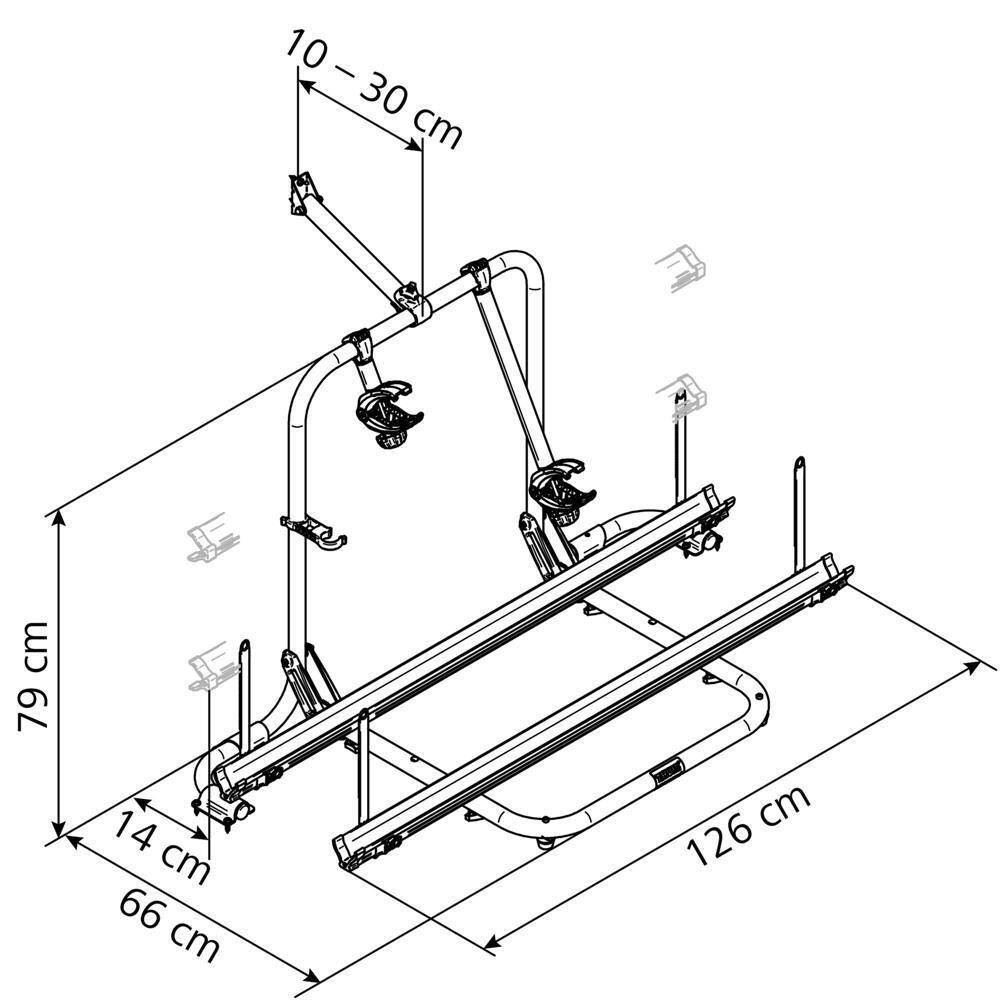 Bike carrier for 2 bikes, extendable to a maximum of 4 bikes, is installed in the motorhome‘s garage. The platform is fixated at 4 points to the floor. The carrier can be folded up while not in use.