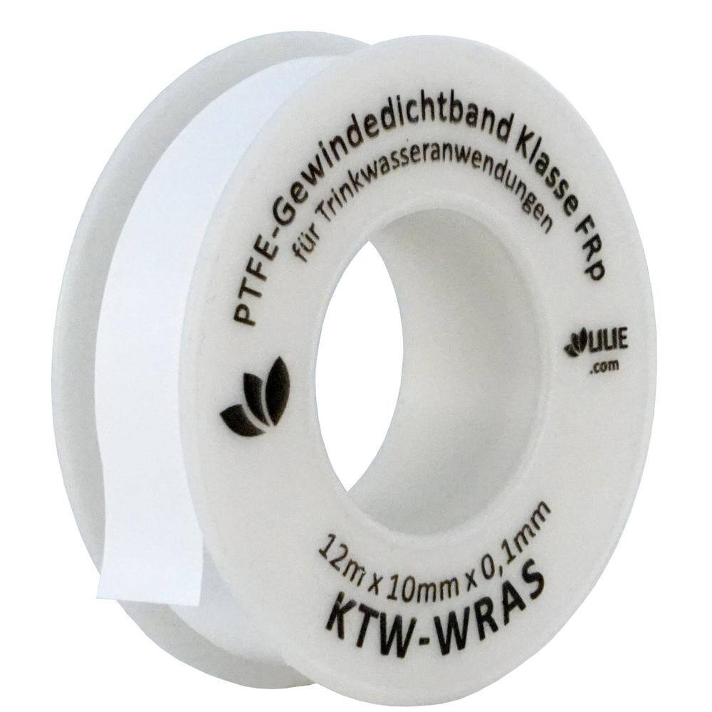 PTFE thread sealing tape for drinking water applications in accordance with DIN EN 751-3 class FRp, DVGW tested. There are 12 m on the roll.