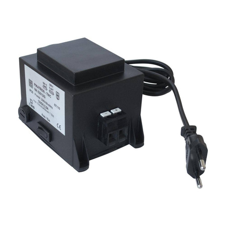 Transformer in a firmly moulded plastic housing. Is fixed with four screws. On/off switch on the housing. Integrated thermal cutoff (127& °C). Max. duty cycle: 1 hour.