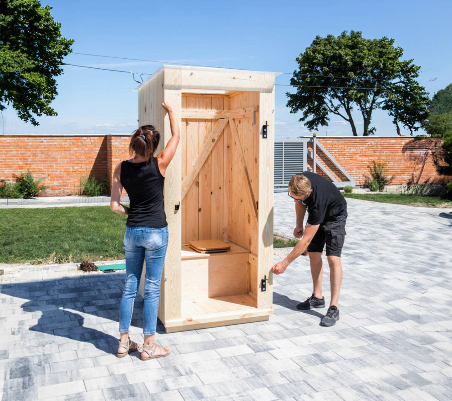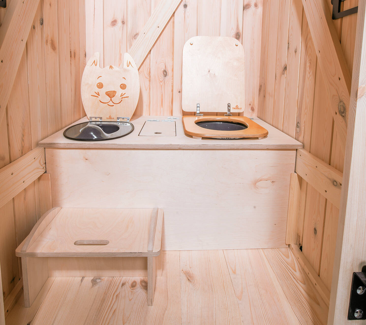 Outdoor composting toilet made of wood with children's toilet and exhaust system as a complete kit.