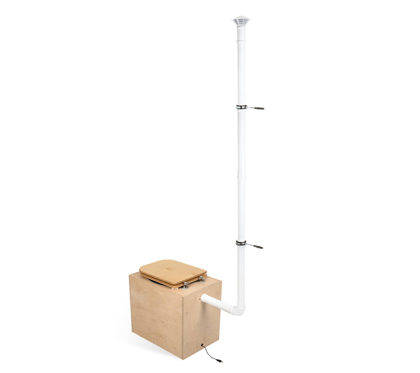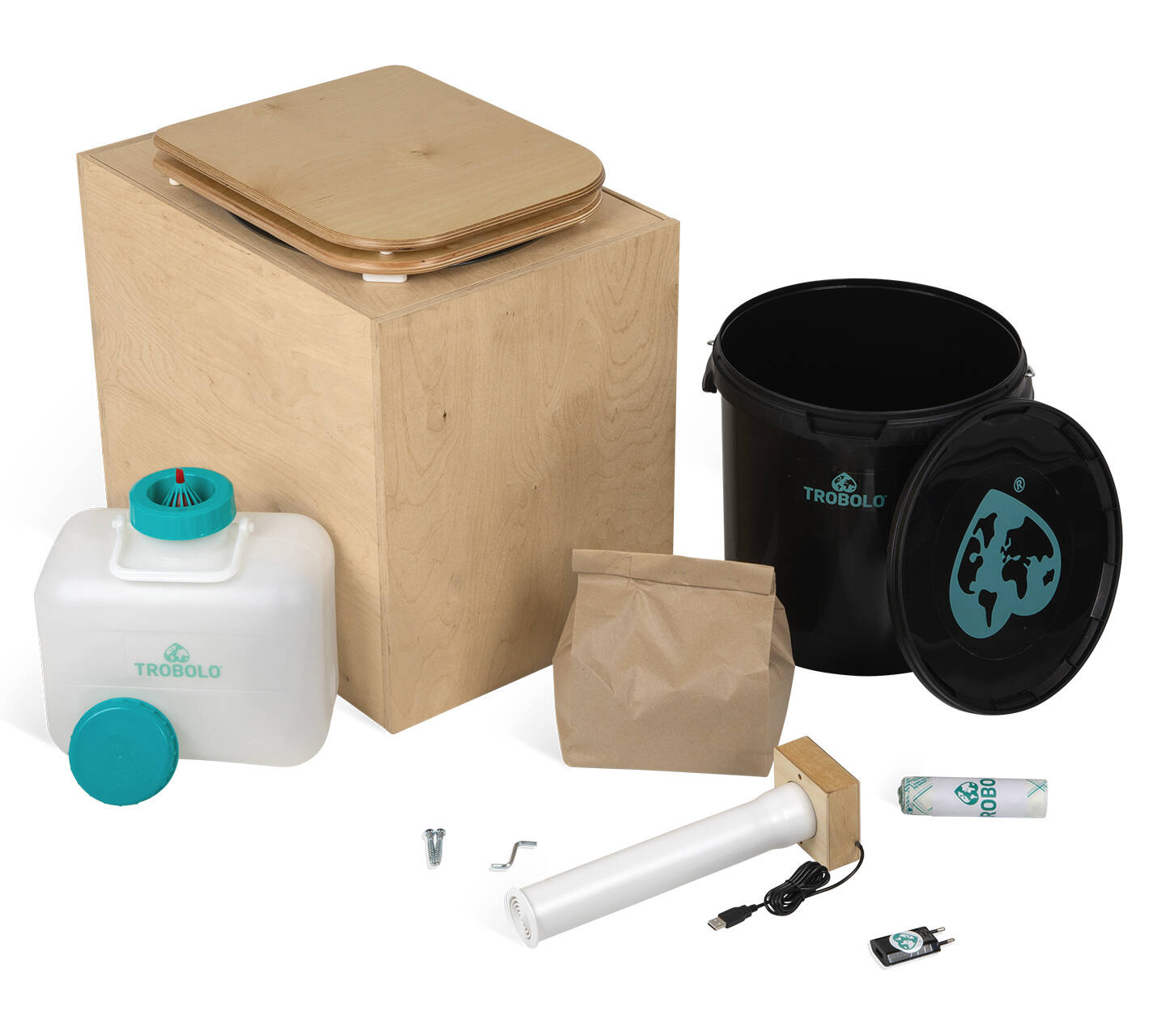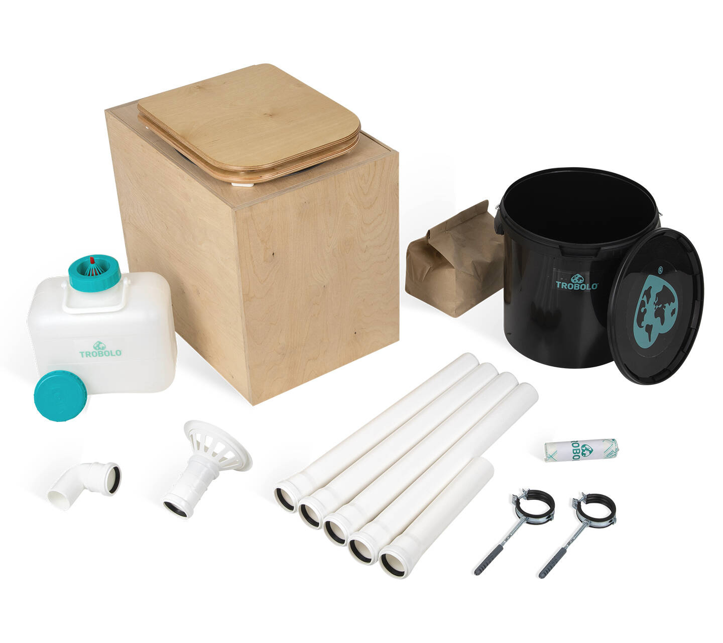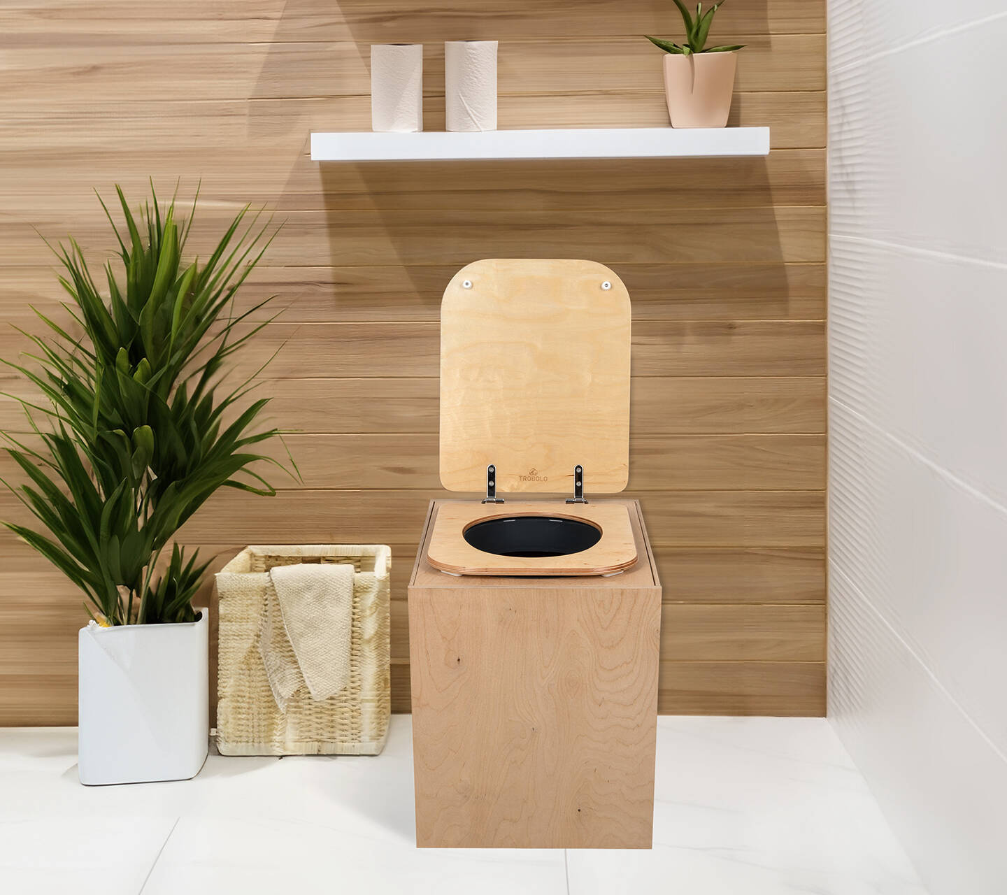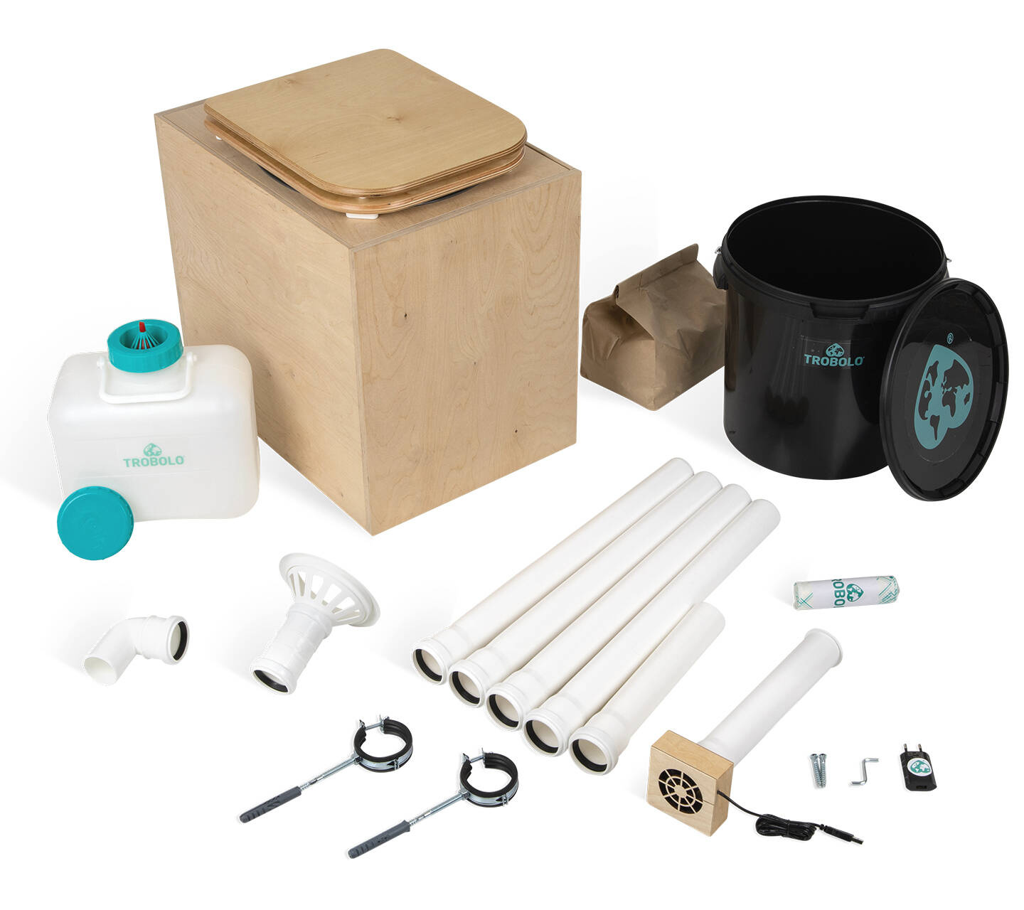 • High-capacity wooden composting toilet with optional exhaust system as a complete kit.