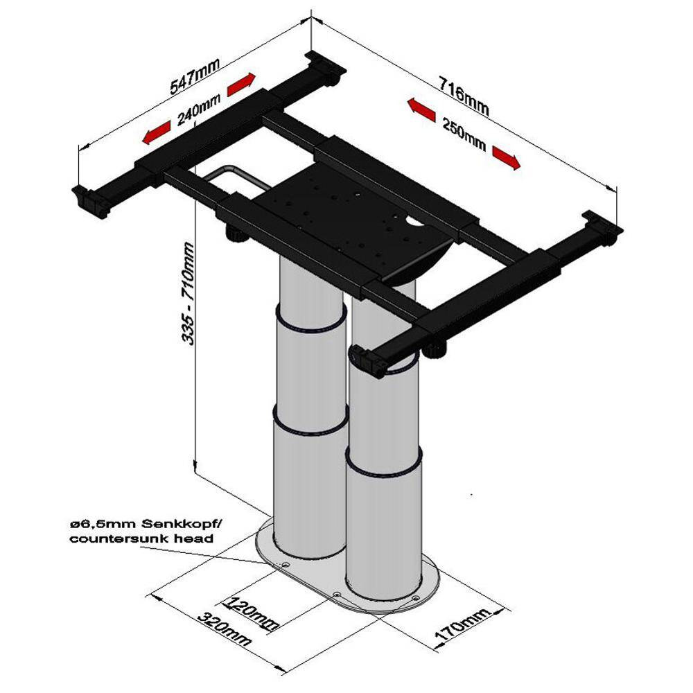 Height-adjustable by 37.5 cm. Bottom height to bottom edge tabletop 33.5 cm. Upper height to bottom edge tabletop 71 cm. Vertical and horizontal shifting by 24 cm and 25 cm, can be locked individually.