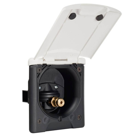 City water connection, thermoplastic. Pure white (RAL 9010), black or anthracite. With pressure reducer and magnetic hinged lid, water pressure is reduced down to 1.1 bar. Cut-out dimensions: 85.5 x 90 mm.