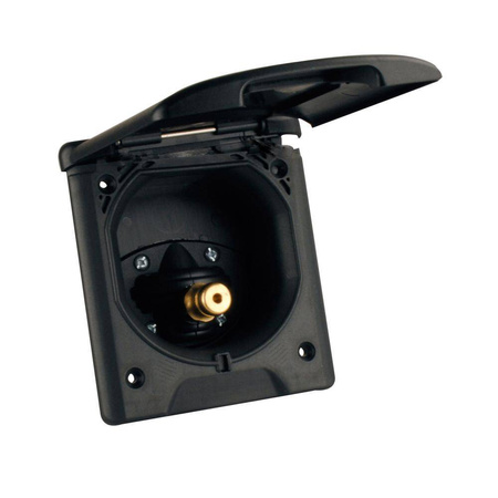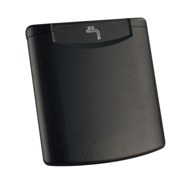 City water connection, thermoplastic. Pure white (RAL 9010), black or anthracite. With pressure reducer and magnetic hinged lid, water pressure is reduced down to 1.1 bar. Cut-out dimensions: 85.5 x 90 mm.