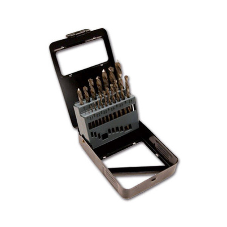 Zestaw 19 wierteł ze stali HSS.Asortyment wierteł od 1 do 10 mm.Zapakowane w metalowe pudełko.Waga 590 g.