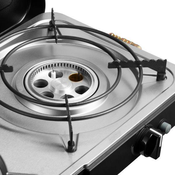 - Stabilność: Gumowe nóżki zapobiegają przesuwaniu się kuchenki, a po użyciu pokrywa zamyka się i mieści w dołączonej torbie transportowej.