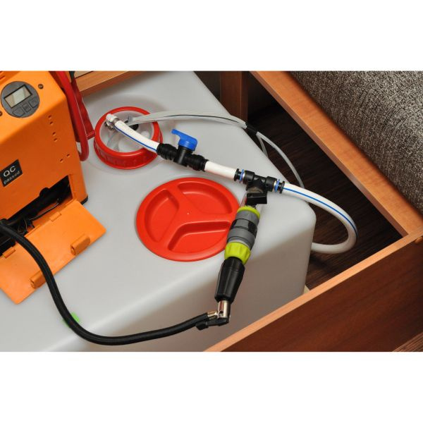 Floë to prosty w montażu system, który pozwala na całkowite opróżnienie instalacji wodnej w kamperze, przyczepie kempingowej czy łodzi – przy użyciu kompresora samochodowego lub pompki nożnej.