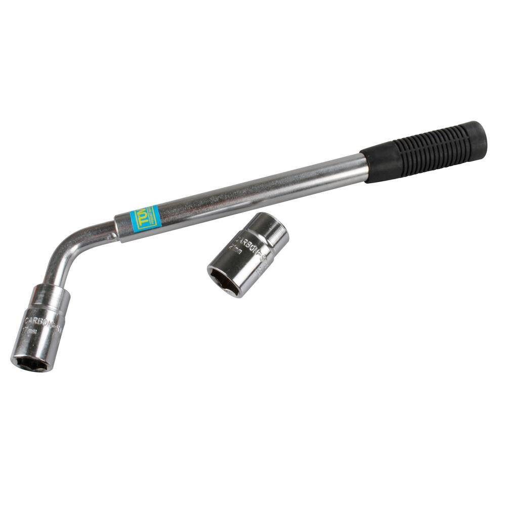 Długie ramię dźwigni zapewnia przenoszenie dużej siły, ułatwiając odkręcanie śrub kół. Wymienna wkładka 17 + 19 mm. Może być również używany z innymi wkładkami. Chromowo-wanadowy. TÜV/GS.