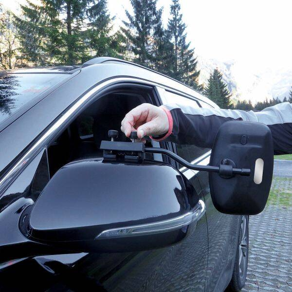 Uniwersalne lusterko pasuje do prawie wszystkich lusterek zewnętrznych pojazdów z regulowanym szkłem. Montuje się je za pomocą dwóch śrub - bez użycia narzędzi. Podstawa wykonana z wysokiej jakości tworzywa sztucznego jest wyjątkowo wytrzymała. Śruby mocujące ze stali nierdzewnej są wyposażone w radełkowany uchwyt i mosiężne nakrętki. Lustro jest wyposażone w dwa obrotowe, pokryte gumą elementy zaciskowe, które zapobiegają jego ślizganiu się. Płytka sprężynowa ze stali nierdzewnej o grubości 2 mm, która jest również pokryta specjalną gumą, służy jako łożysko oporowe. Aerodynamiczna głowica lustra z zakrzywionym szkłem bezpiecznym jest regulowana we wszystkich kierunkach.