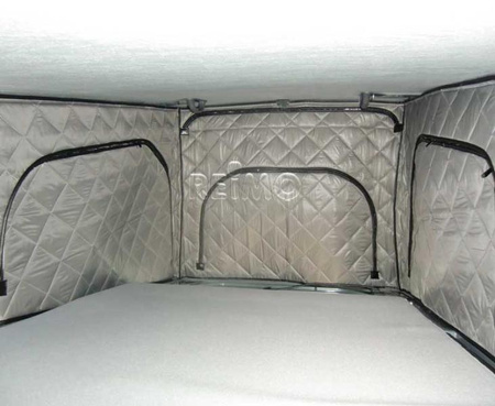 Montaż wewnątrz: za pomocą zatrzasków/rzepów. Ocieplone latem i zimą. Specjalnie zaprojektowana do izolacji miechów namiotowych w modelach Reimo pop-top VW T5/6, krótki rozstaw osi, możliwość podniesienia tyłu.