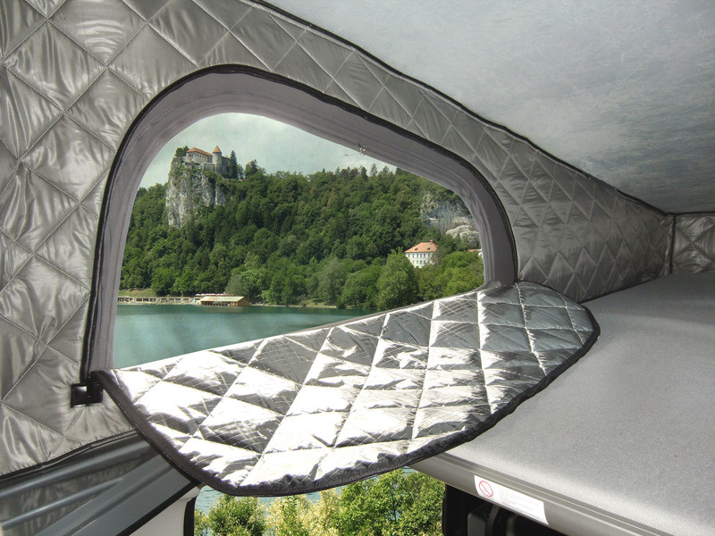 Montaż wewnątrz: za pomocą zatrzasków/rzepów. Ocieplone latem i zimą. Specjalnie zaprojektowana do izolacji miechów namiotowych w dachu typu pop-top Reimo VW T5/6, krótki rozstaw osi, możliwość podniesienia przodu.