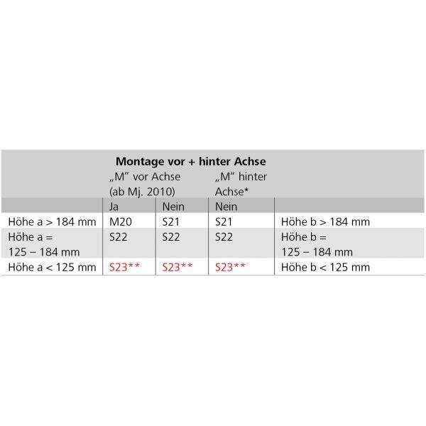 AL-KO Mammut M20 został specjalnie zaprojektowany do montażu przed osią i nadaje się do podwozi AL-KO z wytłoczonym napisem „M” przed osią, w których odległość od dołu ramy do zakłócającego konturu (np. stopnia wejściowego, rury wodnej) wynosi więcej niż 184 mm.