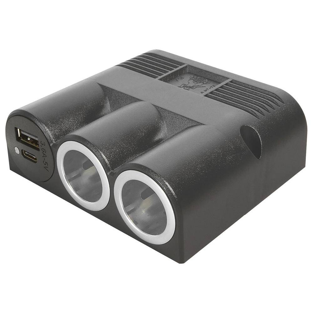 Montowane natynkowo potrójne gniazdo ze zintegrowanym konwerterem napięcia, do ładowania i obsługi smartfonów, urządzeń nawigacyjnych, PDA, aparatów cyfrowych, telefonów komórkowych i innych urządzeń elektronicznych, które mogą być ładowane przez USB-A. Obudowa wykonana z wytrzymałego tworzywa sztucznego i uniwersalna wtyczka do podłączenia do gniazda DIN, gniazda zasilania lub gniazda zapalniczki. Bez płyty bazowej.