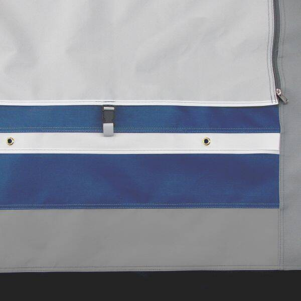 Ściana przednia: składająca się z 4 części, zdejmowana i zwijana, tworząc werandę. Drzwi można zwinąć. Z klapami sztormowymi wewnątrz, sztormowym drążkiem napinającym na zewnątrz i zakrytymi zamkami błyskawicznymi. Zewnętrzne klapy wykonane z tkaniny plandekowej.