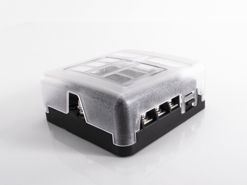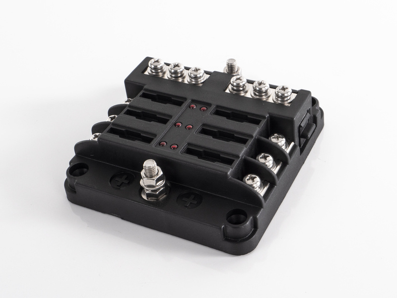 Kompaktowa skrzynka bezpiecznikowo-rozdzielcza dla maksymalnie sześciu obwodów. Czerwona dioda LED natychmiast sygnalizuje przepalenie bezpiecznika.