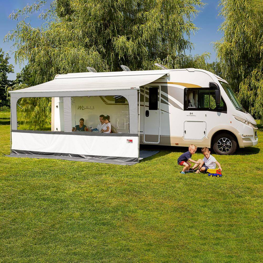 Ta wygodna ściana przednia Blocker Pro 250 marki Fiamma posiada duże okno i przedłużenie podłogi. Wykonana z wodoodpornego winylu, który jest też odporny na promieniowanie UV i nadaje się do prania. Ściana jest łatwa w montażu poprzez wsunięcie górnej części w szynę rurową. W standardzie znajdują się kołki mocujące. Ściana frontowa pasuje do markiz o długości 250 – 260 cm.