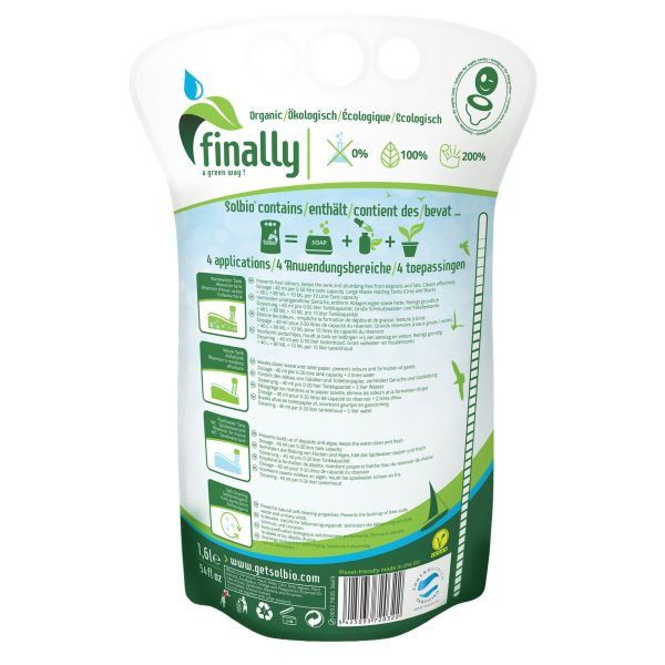 Solbio Toilet Additive 4 in 1 Marine, 1.6 l to zaawansowany, wielofunkcyjny płyn do toalet chemicznych w kamperach, caravanach i łodziach. Ten 100% biodegradowalny produkt na bazie organicznych składników skutecznie działa 4 w 1: czyści toaletę i zbiornik, rozkłada ścieki, odświeża wodę spłukującą oraz utrzymuje higienę całego układu sanitarnego. Idealny do podróży i postojów, wspiera czystość nawet w dużych zbiornikach.