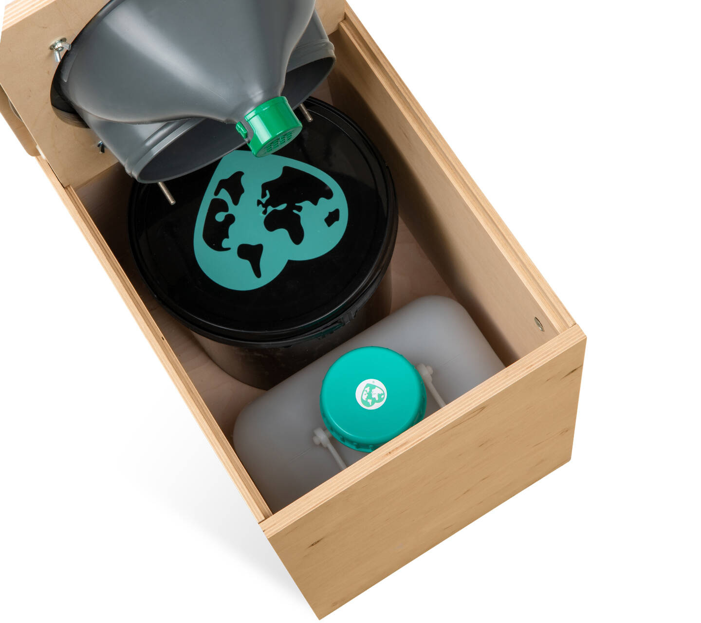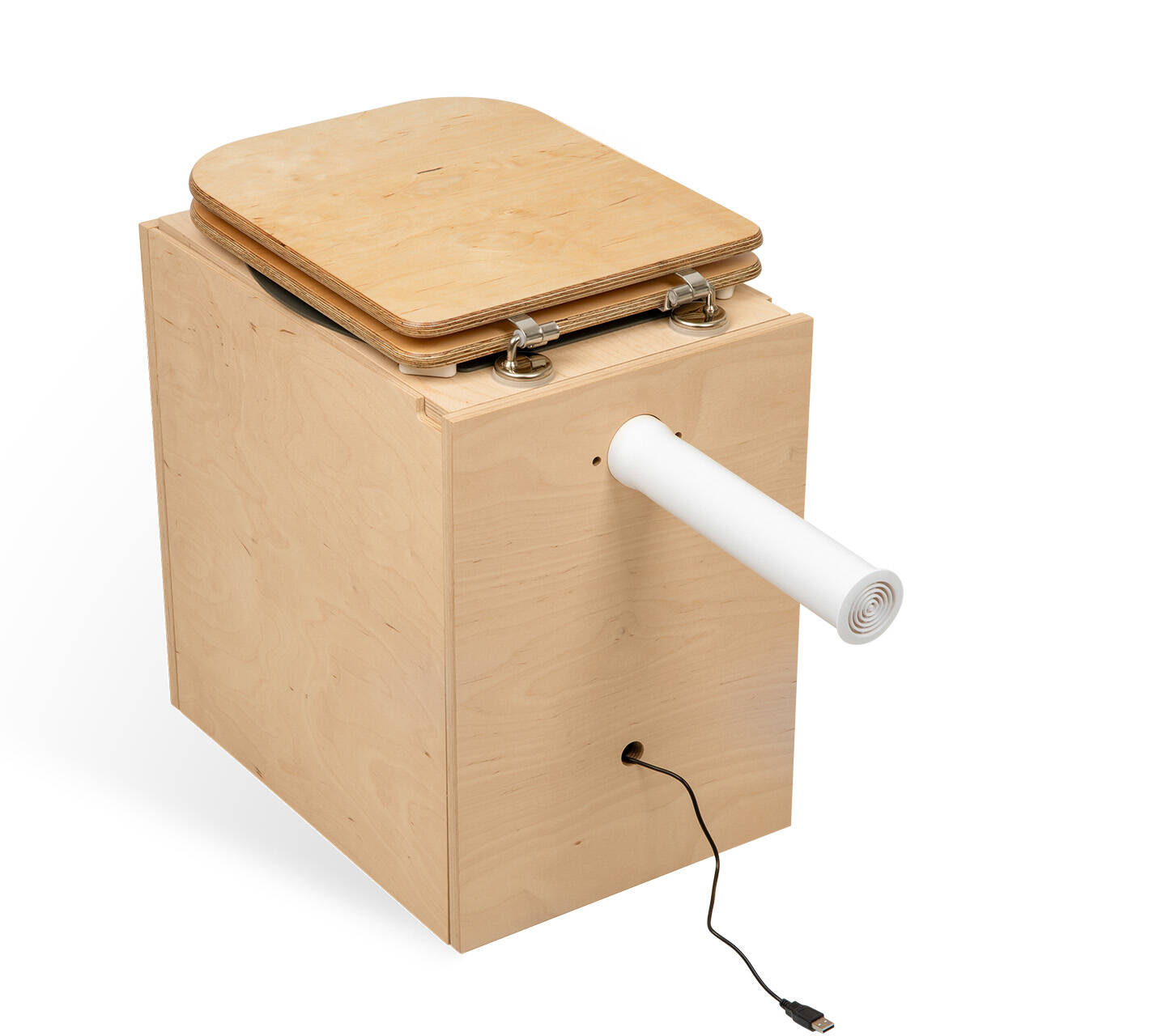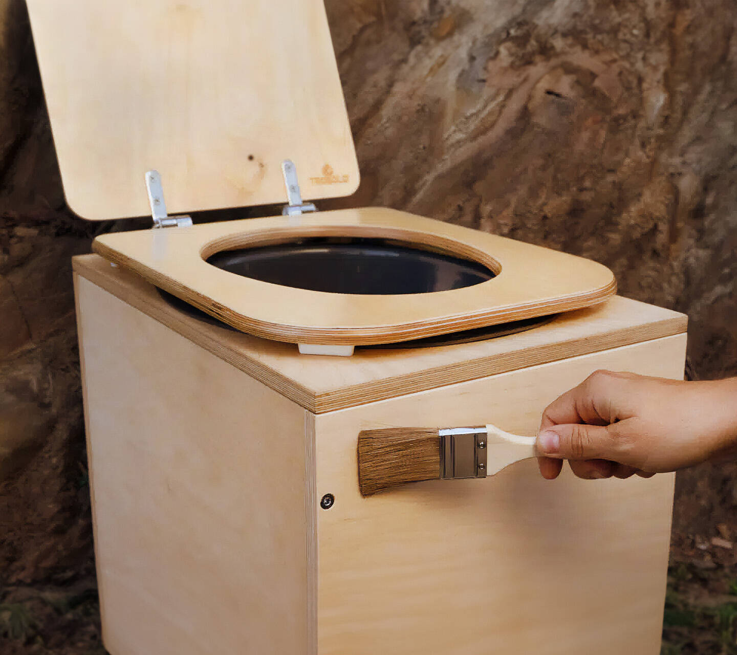 Sprytna drewniana toaleta kompostująca z opcjonalnym układem wydechowym jako kompletny zestaw.