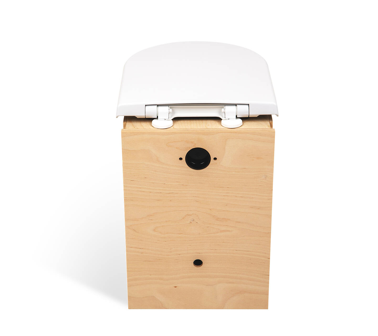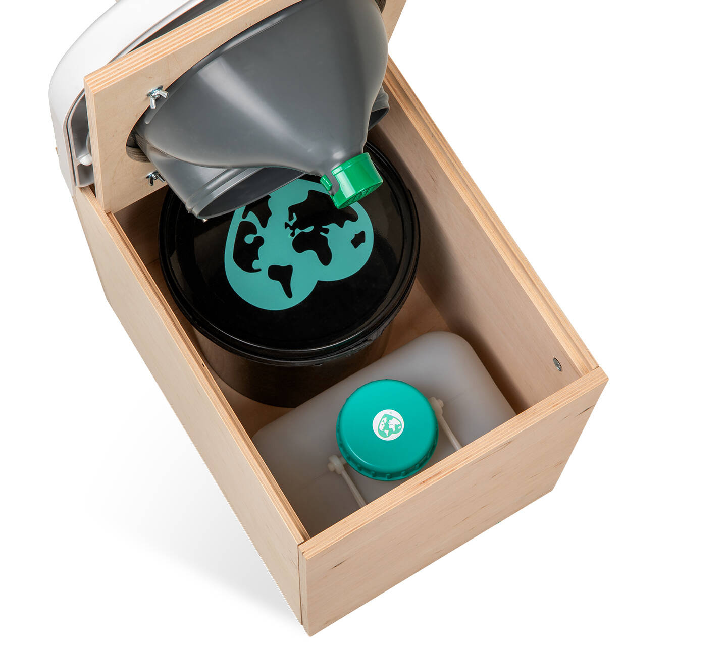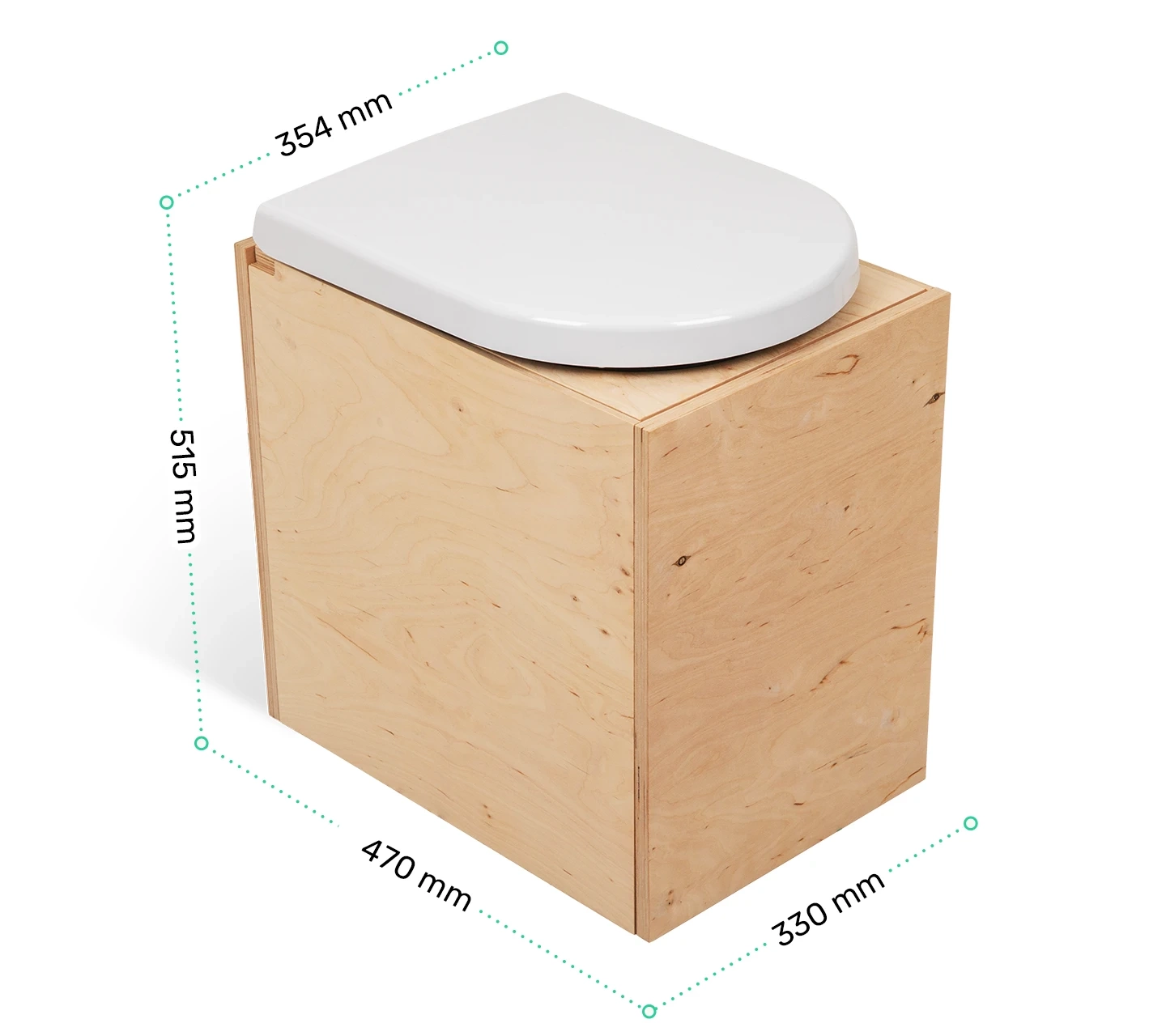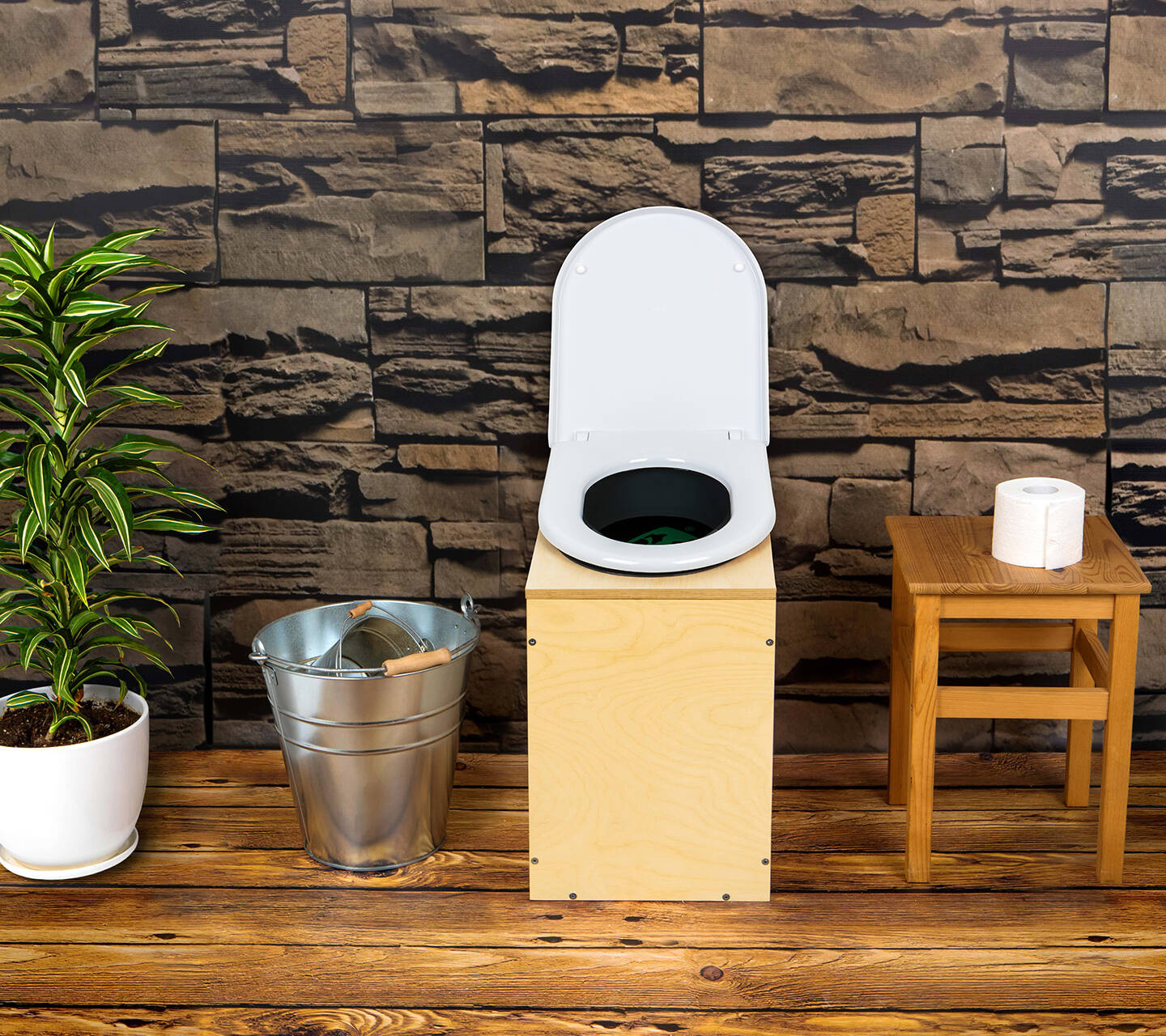 Sprytna drewniana toaleta kompostująca z opcjonalnym układem wydechowym jako kompletny zestaw.