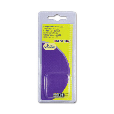 Żarówka G4, całkowicie osadzona w silikonie z dwoma przeciwległymi modułami LED COB.Emituje równomierny strumień ciepłego, białego światła porównywalny z tradycyjną żarówką halogenową.Opakowanie typu blister.