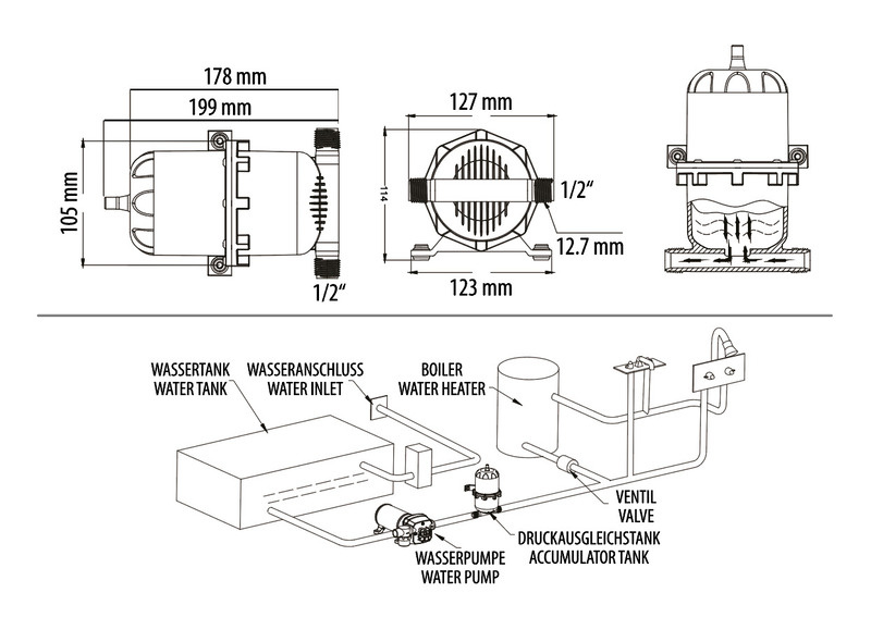 Dzięki zbiornikowi wyrównującemu ciśnienie, woda płynie cicho i równomiernie, bez pulsowania i rozpryskiwania. Dzięki skróceniu czasu włączania i wyłączania wydłuża się żywotność pompy wodnej i chroni się akumulator pojazdu. Jeżeli zużycie wody jest niskie, pompa wodna nie włącza się. Zbiornik wyrównujący ciśnienie można zamontować w dowolnej pozycji. Powietrze jest uwięzione w elastycznej membranie pod stałym ciśnieniem. Ciśnienie powietrza można regulować według potrzeb za pomocą pompki rowerowej. Optymalnie jest, jeśli ciśnienie w zbiorniku wyrównawczym (ustawienie fabryczne 1,2 bara) jest zbliżone do ciśnienia ponownego uruchomienia pompy wodnej. Zbiornik wyrównujący ciśnienie nie wymaga własnego zasilania i nadaje się do wszystkich ciśnieniowych układów wodnych.
