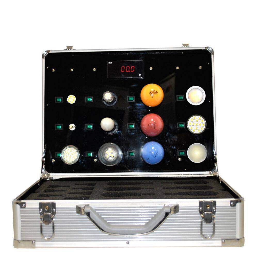 Solidna, zamykana aluminiowa obudowa do testowania i demonstracji źródeł światła. Aktualny całkowity pobór mocy włączonych źródeł światła jest wyświetlany na wyświetlaczu. Jednocześnie można testować/demonstrować 12 źródeł światła. Dostępne są następujące połączenia: